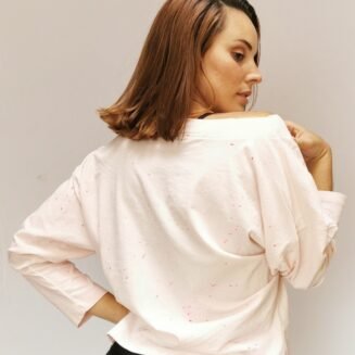 Camibuso color rosa inspirado en las seductora Rana cristal, cosida a mano en nuestros talleres en tela de algodón, silueta suelta y cuello amplio y con chips de tinta vibrante base agua (sin plomo y con tacto suave) aplicados en estampación artesanal.